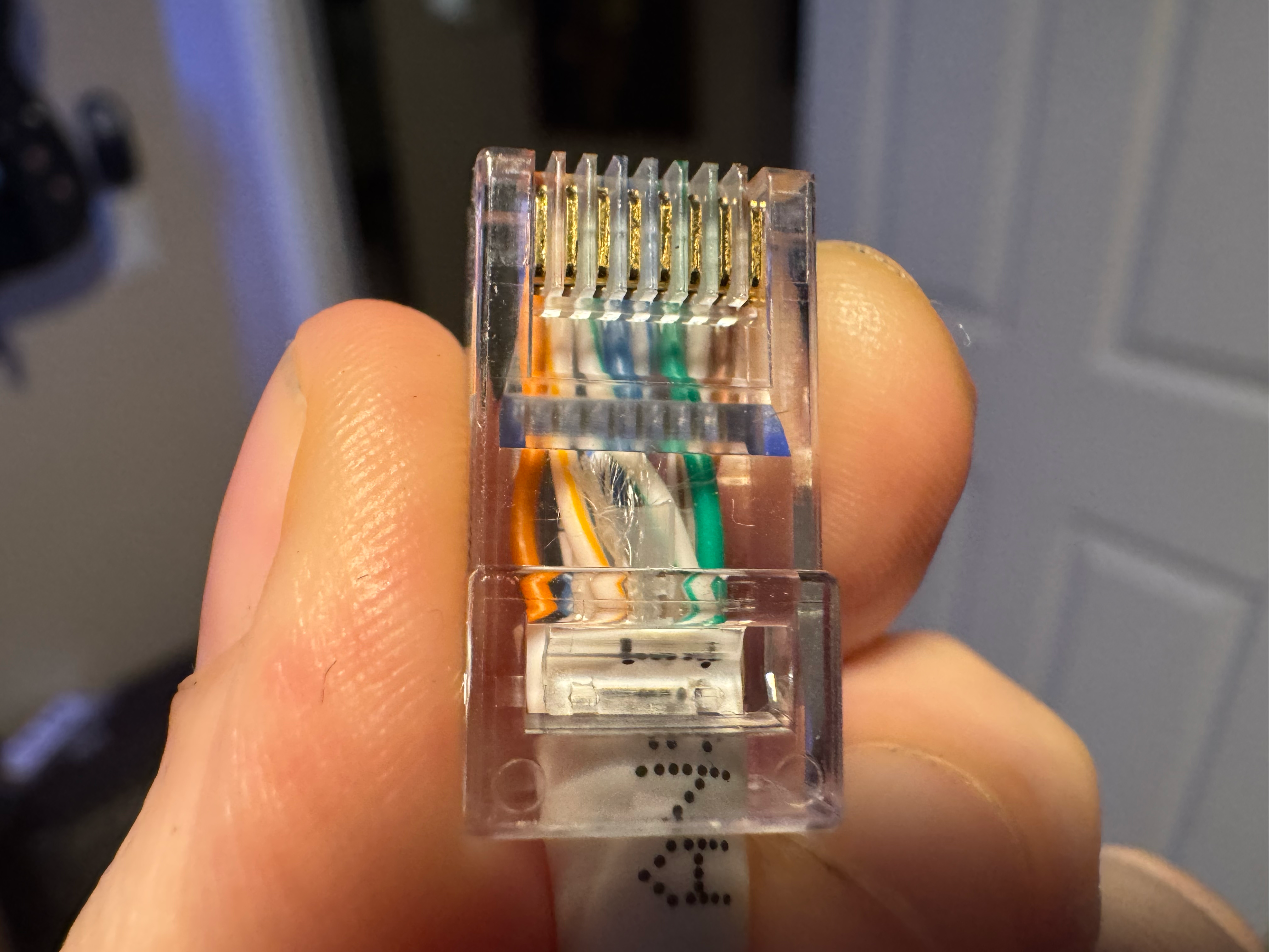 - Slide into the RJ45 connector (check each wire goes fully to the front).