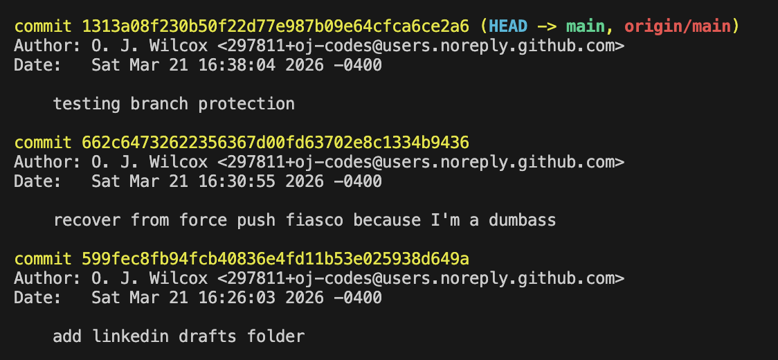 I force pushed to main on my internal docs repo last week and wiped out an entire session of work I'd committed from my phone.
